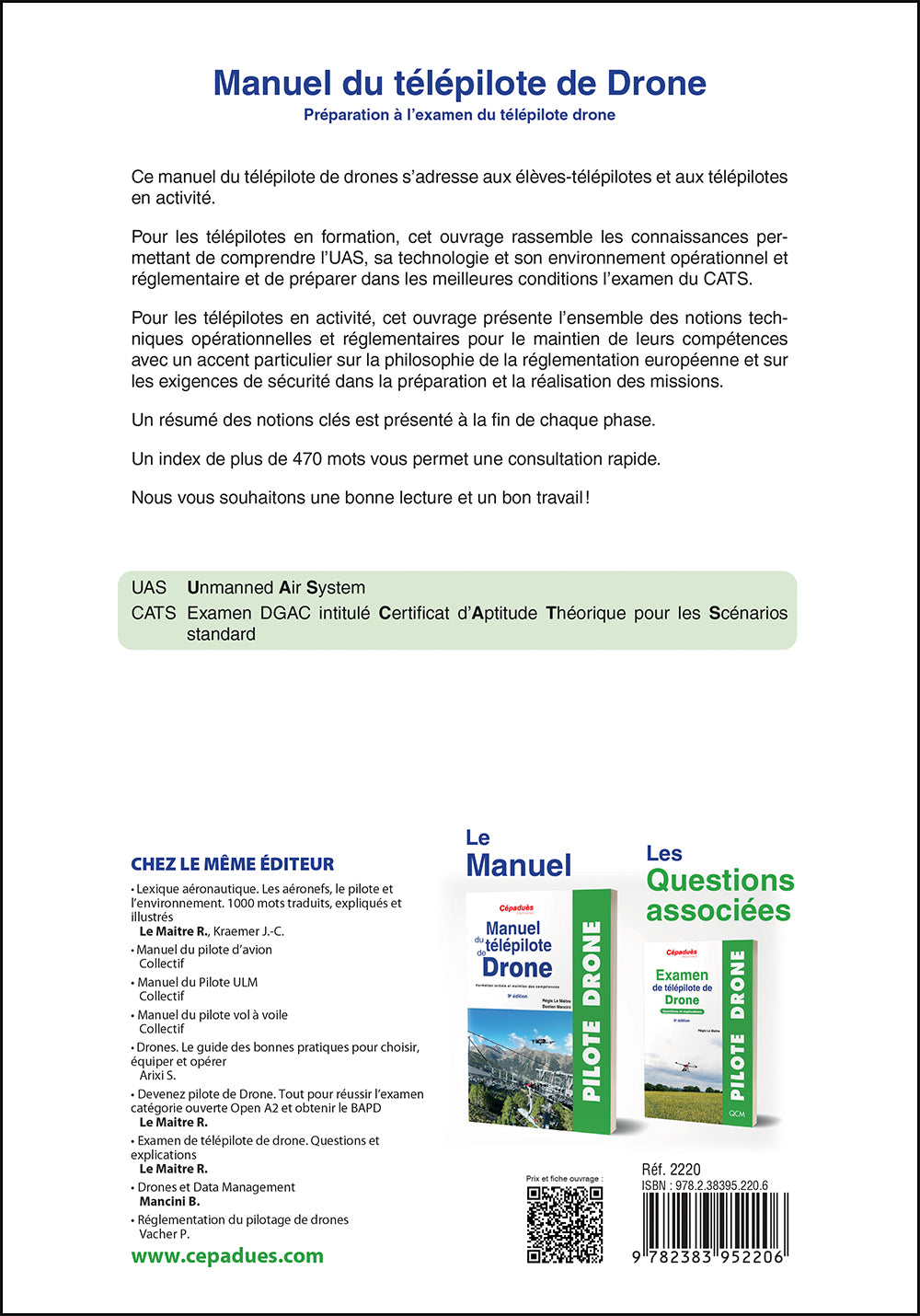 Pour les télépilotes en formation, cet ouvrage rassemble les connaissances permettant de comprendre l’UAS, sa technologie et son environnement opérationnel et réglementaire et de préparer dans les meilleures conditions l’examen du CATS.