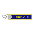 Porte-clés flamme en tissu bleu et tissé en jaune recto : FLYING IS MY LIFE /