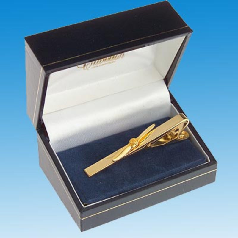 Pince à cravate hélice bipale miniature dorée à l'or fin 24 carats, dans son écrin.