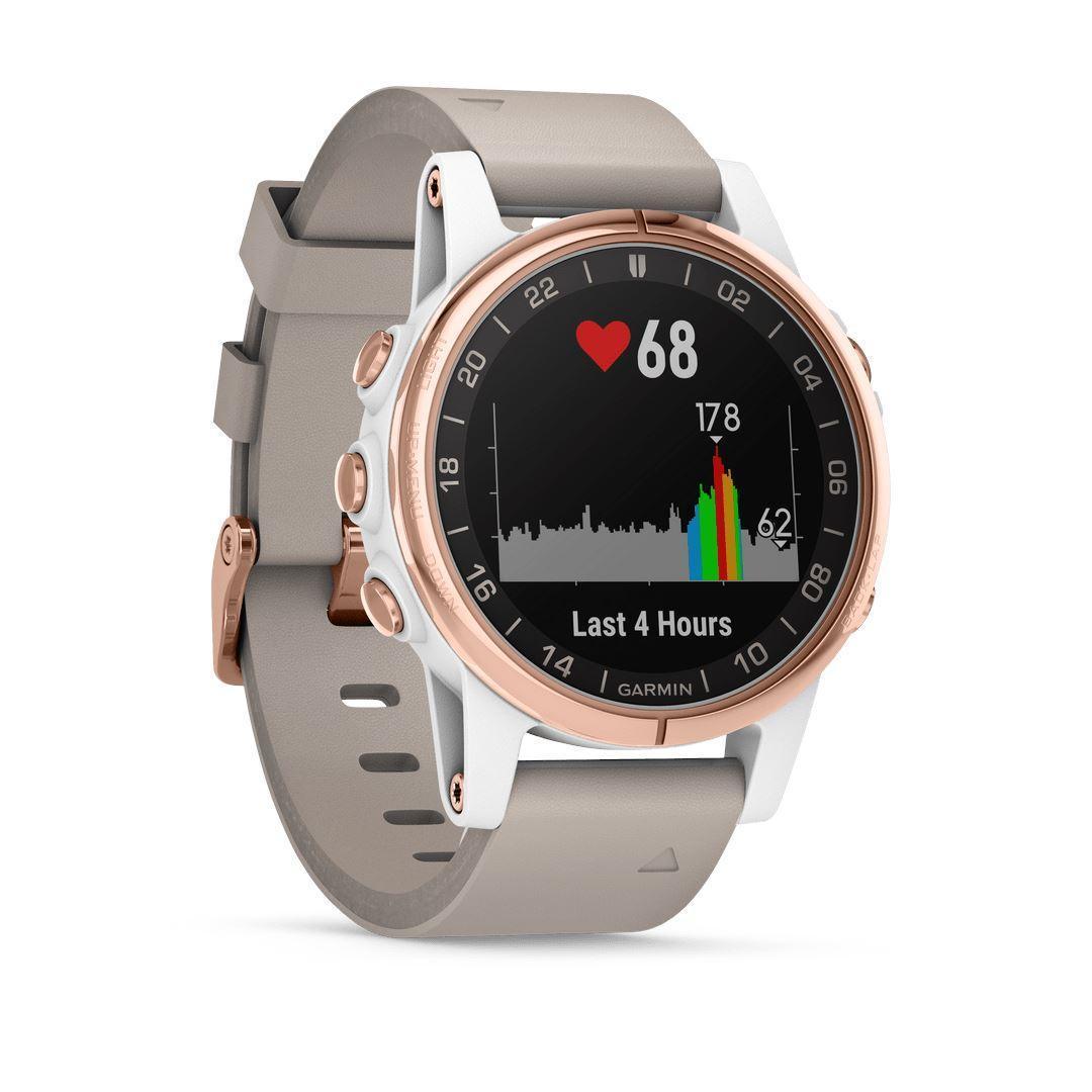 Airmen and air adventurers come in all sizes. That's why the D2 Delta series offers many models that vary in size to suit every wrist and every lifestyle. Featuring a smaller size (42 mm) with a rose gold bezel, a premium beige leather band and a scratch-resistant curved sapphire crystal lens, the D2 Delta S model is designed for those looking for all the Garmin D2 technology in a more compact size. With a wide range of color mapping, weather, waypoint reference and flight log functions, the D2 Delta S is a true GPS-based flight system you can rely on for reliable reference navigation in your cockpit. Then, between flights, you can use the latest sports watch features - including Elevate wrist heart rate monitoring ™¹, daily activity monitoring², training measurements and much more - to stay in shape. For those intense activities, each D2 Delta version comes with a soft, white silicone sports strap, offering easy replacement of the QuickFit® band without tools. And wherever you go, smart notifications¹ (emails, text messages, alerts, and more) can be displayed to help you stay informed while on the go.