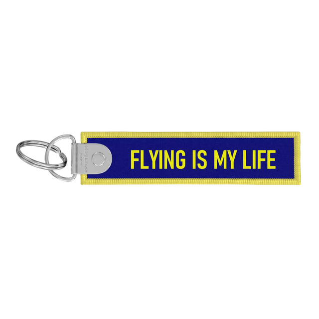 Porte-clés flamme en tissu bleu et tissé en jaune recto : FLYING IS MY LIFE /