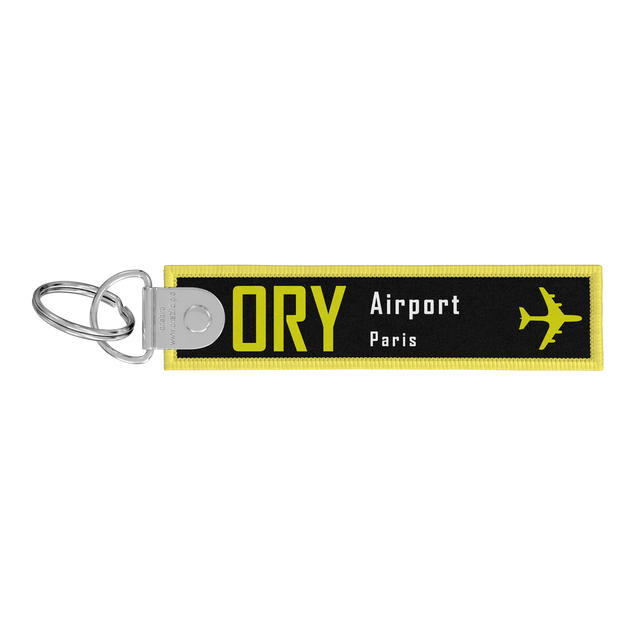 Porte-clés flamme "Remove Before Flight" ORLY en tissu noir brodé blanc et jaune.