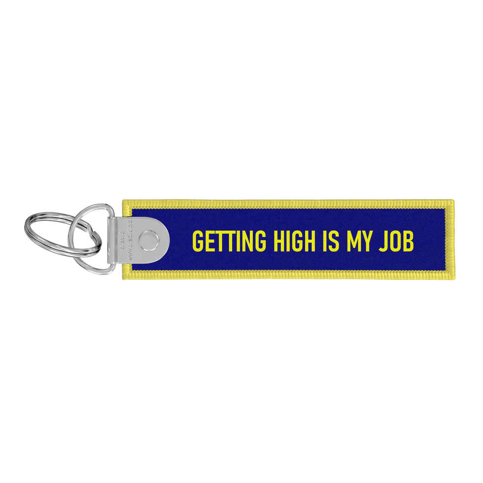 Porte-clés flamme en tissu bleu et tissé en jaune recto : FLYING IS MY LIFE /