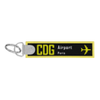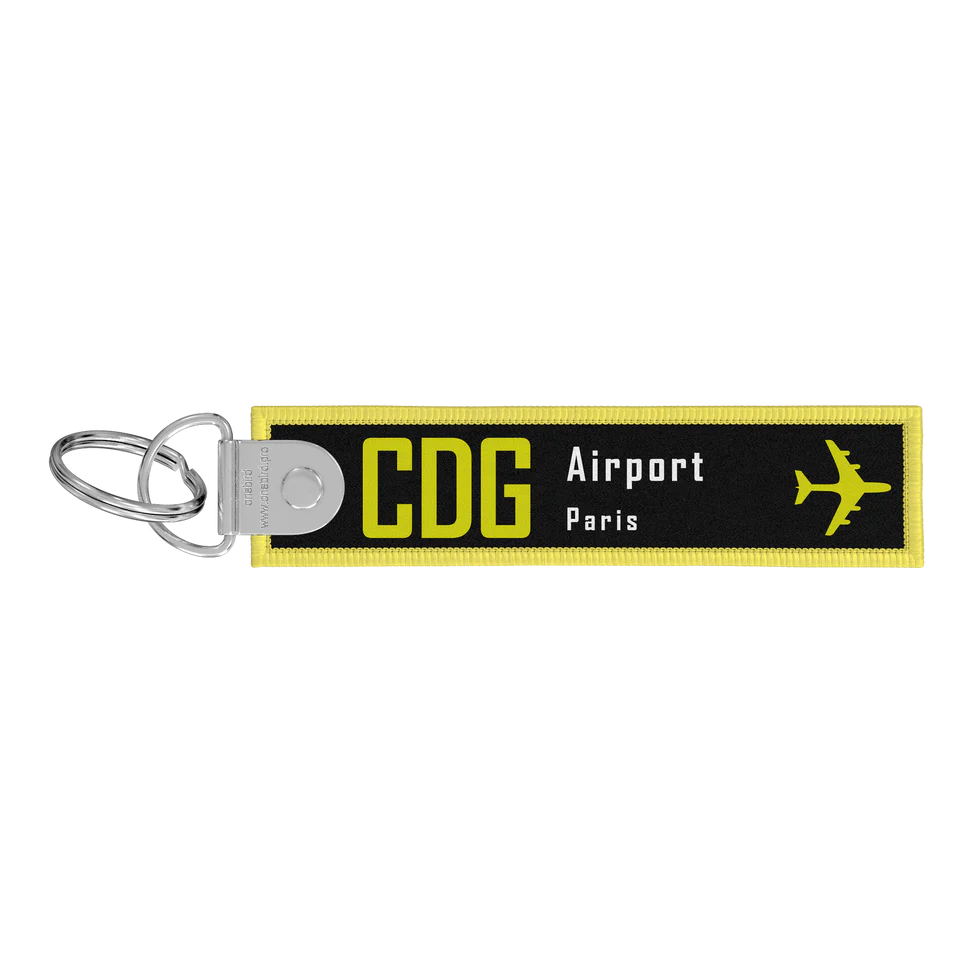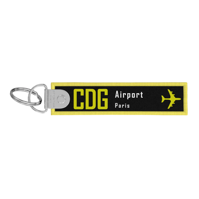 Porte-clés flamme "Remove Before Flight" aéroport Charles de Gaulle - Paris Roissy en tissu noir brodé blanc et jaune.